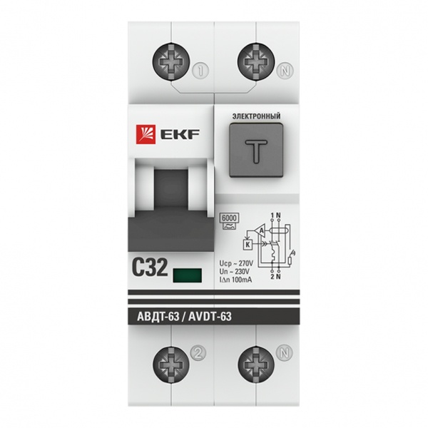 • Дифференциальный автомат EKF PROxima АВДТ-63 1P+N C32А 100мА тип А однофазный электронный 6кА (дифавтомат, АВДТ)