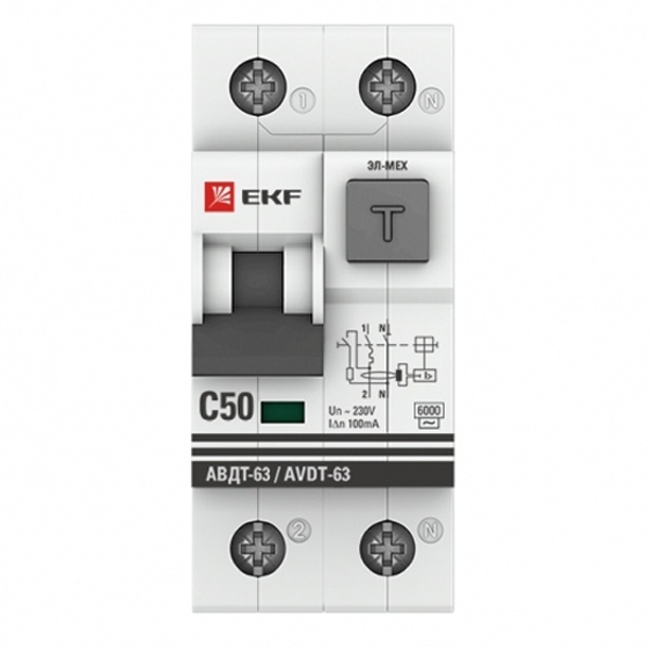 Компания EKF представляет линейку АВДТ-63 PROxima, в которую входит компактная модель со встроенной защитой от сверхтоков модульного типа с отключающей возможностью в 6000 Ампер. Порог по току утечки составляет 0,1 Ампер, уставка типа С. Это новое устройство защиты сочетает в себе функции автоматического выключателя и УЗО и обеспечивает 3 типа защиты: по току утечки, от КЗ и перегрузок. Данная модель обеспечивает безопасность оборудования от возгорания под воздействием тока утечки. Прибор чаще можно встретить на жилых и небольших коммерческих объектах. Аппарат класса АС защищает от синусоидальных переменных токов утечки в цепях питания электрооборудования. Местом использования выступают вводно-распределительные устройства, главные распределительные щиты и силовые установки. Дифавтомат с 2 полюсами 1P+N рассчитан на номинальную нагрузку тока 50 Ампер. К его конструктивным особенностям относят наличие индикатора срабатывания по току утечки, току КЗ или при перегрузке, кнопки тестирования для проверки срабатывания АВДТ и рычага управления в 2 положениях. Автомат имеет следующие параметры: ширина – 35,6 мм, высота – 81,5 мм, глубина – 72 мм.