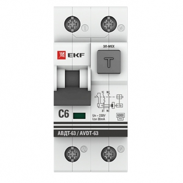 Дифференциальный автомат класса АС серии АВДТ-63 PROxima производства EKF представляет собой компактное устройство со встроенной защитой от сверхтоков. Оно применимо в однофазных электросетях переменного тока с частотой 50 Герц и напряжением до 230 Вольт. АВДТ выполняет функцию обнаружения дифференциального тока, сравнивает его со значением тока срабатывания и отключает защищаемую цепь, если дифференциальный ток превышает это значение. Также с помощью данного агрегата осуществляется автоотключение установки при возникновении КЗ и перегрузок. Дифавтомат защищает человека от поражения током при непосредственном касании токопроводящих цепей. Данная модель рассчитана на номинальную нагрузку тока 6 Ампер при допустимом значении тока утечки – 0,03 Ампер. Она обладает высокой коммутационной способностью 6000 Ампер и характеризуется уставкой типа C. Аппарат класса АС обеспечивает защиту от утечек синусоидального тока. Модульное устройство шириной 2 модуля имеет 2 полюса: 1P+N и монтируется на дин-рейку простым защелкиванием. Оно оснащено удобным рычагом управления с индикацией срабатывания по току утечки и току короткого замыкания и перегрузки. Кнопка «Тест» позволяет следить за работоспособностью устройства. Размеры АВДТ-63: ширина – 35,6 мм, высота – 81,5 мм, глубина – 72 мм.