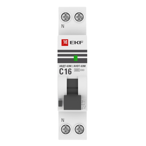 • Дифавтомат EKF PROxima АВДТ-63М 1P+N C16А 10мА тип АС однофазный электронный 6кА 1 модуль (дифференциальный автомат, АВДТ)