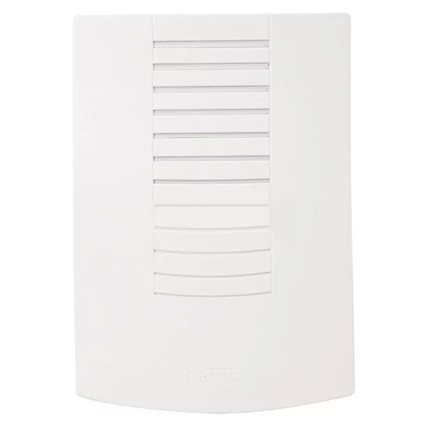 Представленный здесь дверной звонок «Двухтональный» представляет собой объемную фигуру, которая при всей простоте необычайно элегантна. Утонченный аристократизм придает данному изделию легкая волна передней крышки белого пластикового корпуса, которая как бы сходит на нет в своей нижней части.