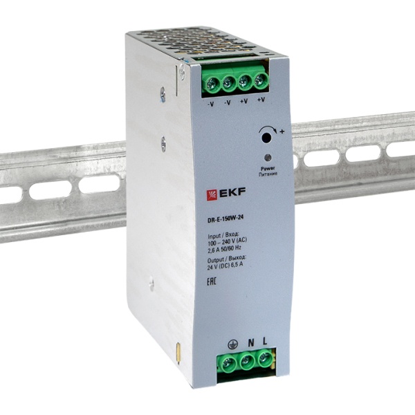Блок понижающего преобразователя напряжения 230 Вольт на 24 Вольта мощностью 150 Вт на дин рейку DR-E DR-E-150W-24