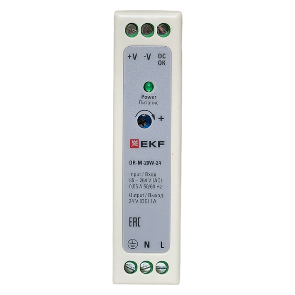 Блок понижающего преобразователя напряжения 230 Вольт на 24 Вольта мощностью 20 Вт на дин рейку DR-M DR-M-20W-24