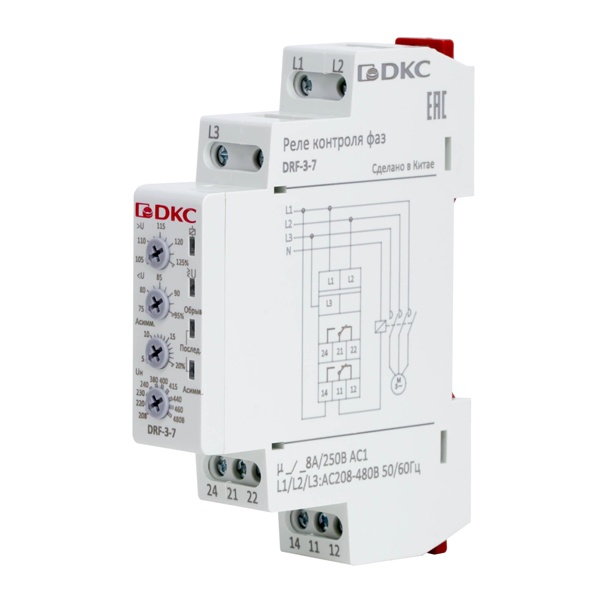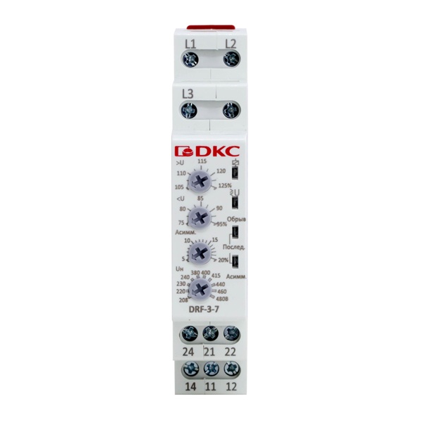 Реле контроля фаз DRF-3-7 предназначено для мониторинга состояния фаз в трёхфазной электрической сети. Устройство анализирует параметры сети в реальном времени и реагирует на критические отклонения. При выявлении таких неисправностей, как перекос фазного напряжения (асимметрия), неправильное чередование фаз или обрыв одной из фаз, реле формирует управляющий сигнал для отключения защищаемого оборудования, предотвращая возможные повреждения и аварийные ситуации. DRF-3-7 обеспечивает надёжную защиту электродвигателей и других трёхфазных потребителей, повышая безопасность и стабильность работы системы.
