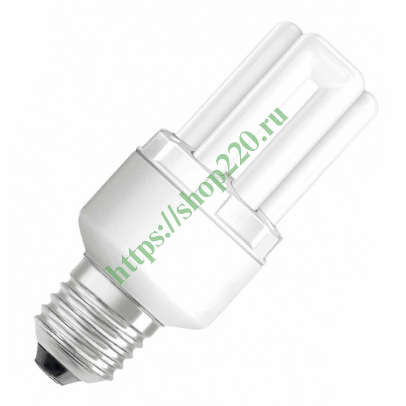 Энергосберегающая компактная люминесцентная лампа Osram мощностью 7 Ватт с цоколем E27 теплого света. Dulux INT LL 7W/825 E27