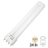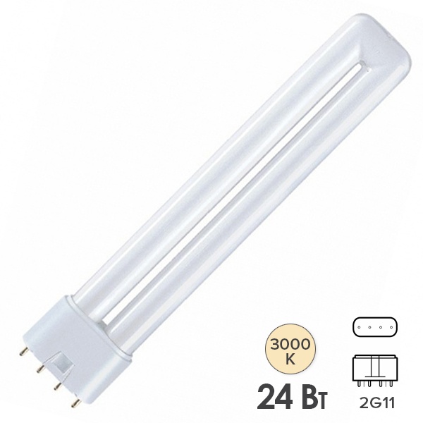 Компактная люминесцентная лампа неинтегрированная OSRAM DULUX L 24Вт с штырьковым одиночным четырехконтактным цоколем 2G10 и двухоборотной колбой. Лицензиатом торговой марки OSRAM в общем освещении является компания LEDVANCE.