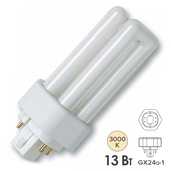 Компактная люминесцентная лампа неинтегрированная OSRAM DULUX T/E PLUS 13Вт с штырьковым одиночным четырехконтактным цоколем GX24Q с укороченным корпусом и трехоборотными колбами. Короткая и компактная версия. Лицензиатом торговой марки OSRAM в общем освещении является компания LEDVANCE.