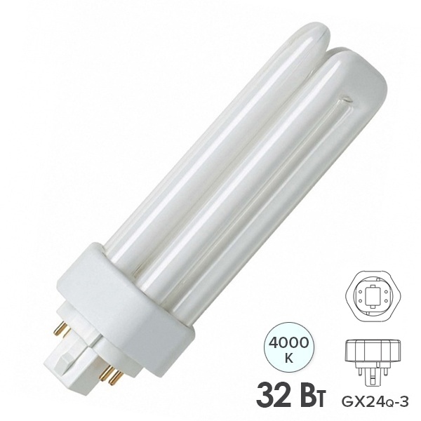 Компактная люминесцентная лампа неинтегрированная OSRAM DULUX T/E PLUS 32Вт с штырьковым одиночным четырехконтактным цоколем GX24Q с укороченным корпусом и трехоборотными колбами. Короткая и компактная версия. Лицензиатом торговой марки OSRAM в общем освещении является компания LEDVANCE.