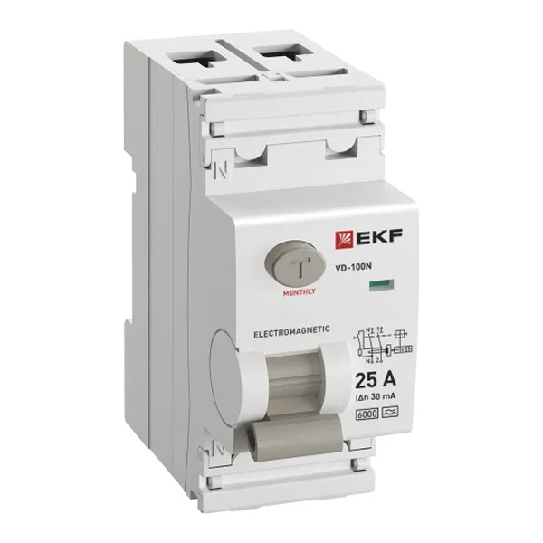 • УЗО EKF PROxima ВД-100N 2П 25А 30мА тип A 6кА (электромеханическое) (ВДТ)