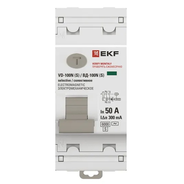 • УЗО EKF PROxima ВД-100N (S) 2П 50А 300мА тип AC селективное 6кА (электромеханическое) (ВДТ)