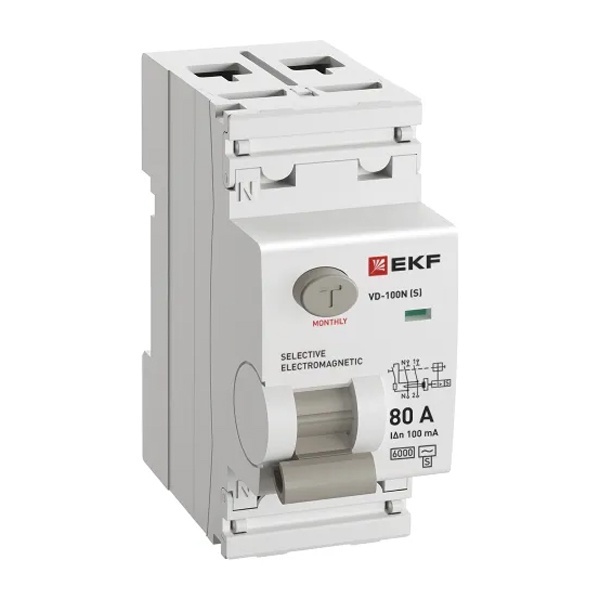 УЗО EKF PROxima ВД-100N (S) 2П 80А 100мА тип AC селективное 6кА (электромеханическое) (ВДТ) E1026MS80100