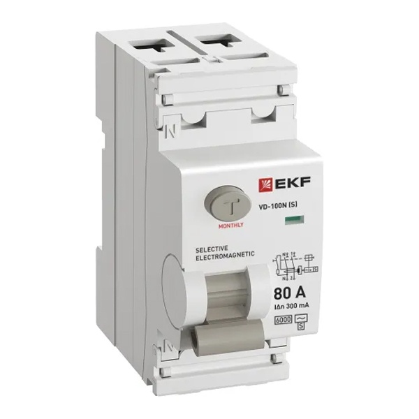 УЗО EKF PROxima ВД-100N (S) 2П 80А 300мА тип AC селективное 6кА (электромеханическое) (ВДТ) E1026MS80300