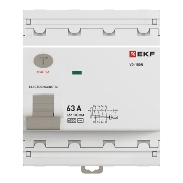 УЗО EKF PROxima ВД-100N 4П 63А 100мА тип AC 6кА (электромеханическое) (ВДТ) E1046M63100