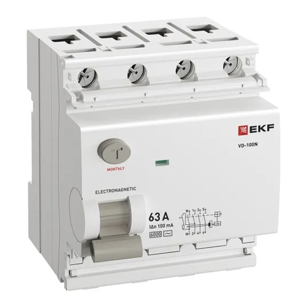 • УЗО EKF PROxima ВД-100N 4П 63А 100мА тип AC 6кА (электромеханическое) (ВДТ)