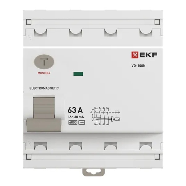 • УЗО EKF PROxima ВД-100N 4П 63А 30мА тип AC 6кА (электромеханическое) (ВДТ)