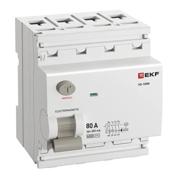 • УЗО EKF PROxima ВД-100N 4П 80А 300мА тип AC 6кА (электромеханическое) (ВДТ)