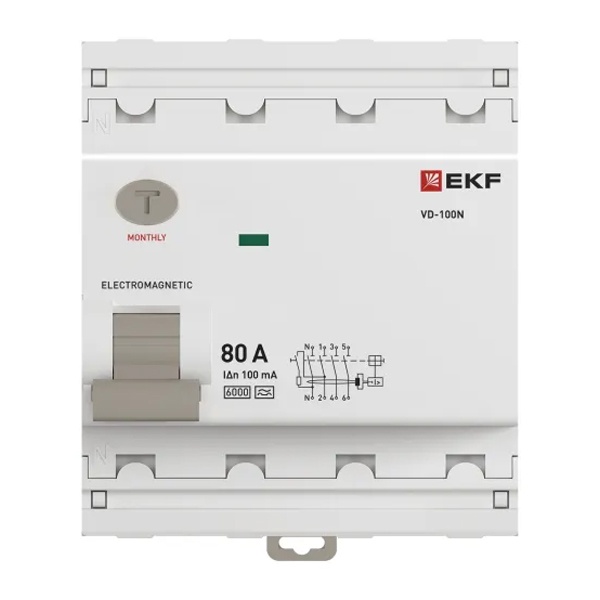 • УЗО EKF PROxima ВД-100N 4П 80А 100мА тип A 6кА (электромеханическое) (ВДТ)