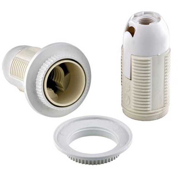 Патрон Е14 с прижимным кольцом белый — практичный патрон для ламп с цоколем E14 (миньон), предназначенный для установки в светильники и декоративные осветительные приборы. Прижимное кольцо позволяет надежно зафиксировать плафон, абажур или декоративное кольцо, обеспечивая аккуратный внешний вид и удобство сборки.