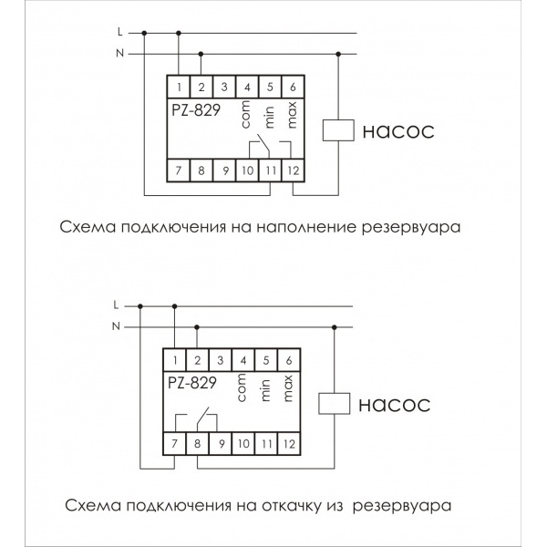 Реле PZ-829 используется для контроля и поддержания заданного уровня токопроводящих жидкостей в резервуарах, бассейнах, водонапорных башнях и т.п. и управления электродвигателями насосных установок. Автоматы не используются для контроля дистиллированной воды, бензина, масла, керосина, этиленгликоля, сжиженного газа.