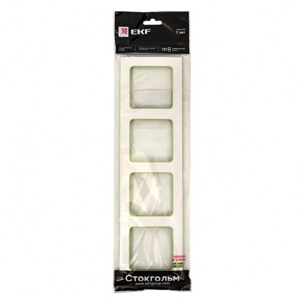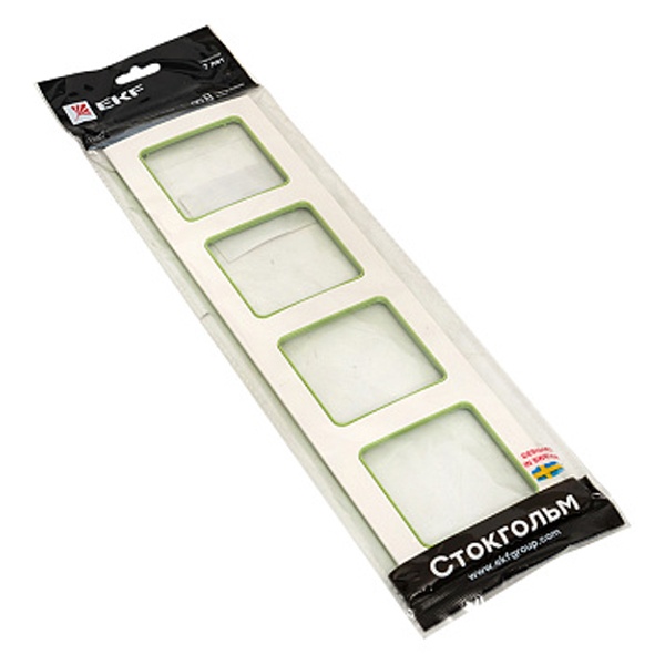 Четырехпостовое обрамление из пластика прямоугольной формы, для электроустановочных механизмов ЕКФ, коллекция Стокгольм, белого цвета с зеленой полосой EAM-G-303-10