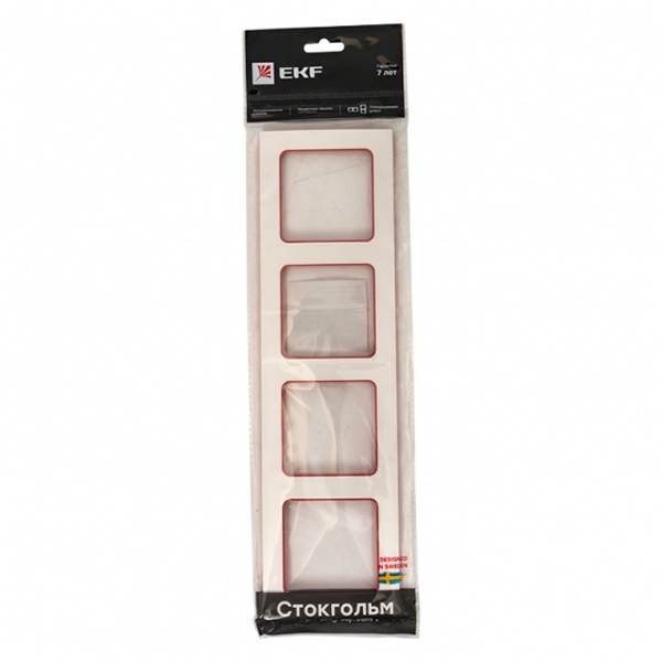 Четырехпостовое обрамление из пластика прямоугольной формы, для электроустановочных механизмов ЕКФ, коллекция Стокгольм, белого цвета с красной полосой EAM-G-305-10