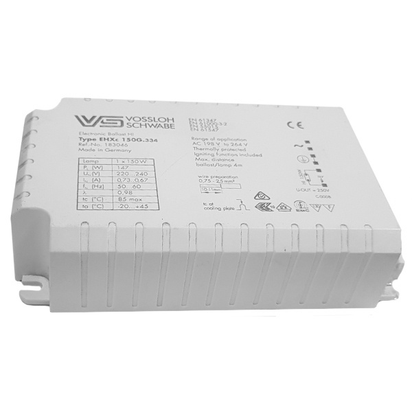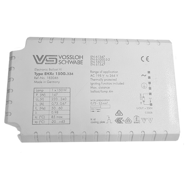 Электронный пускорегулирующий аппарат (ЭПРА) Vossloh Schwabe EHXc 150G.334 мощностью 150 Вт предназначен для работы с металлогалогенными лампами, обеспечивая стабильный запуск, оптимальный рабочий режим и длительный срок службы осветительных приборов. Это профессиональное решение для объектов, где требуется надежное, энергоэффективное и безопасное освещение с высокой световой отдачей и точной цветопередачей.