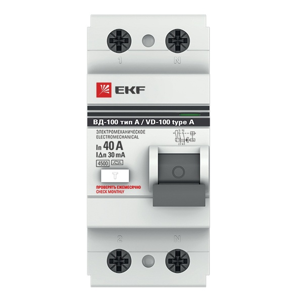 • УЗО EKF PROxima ВД-100 2P 40А/ 30мА (электромеханическое) А (ВДТ)