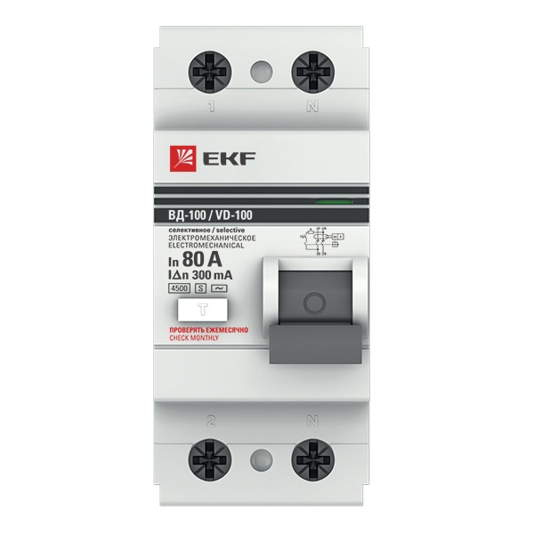 • УЗО EKF PROxima ВД-100 2P 80А/300мА (электромеханическое) АС селективное (ВДТ)