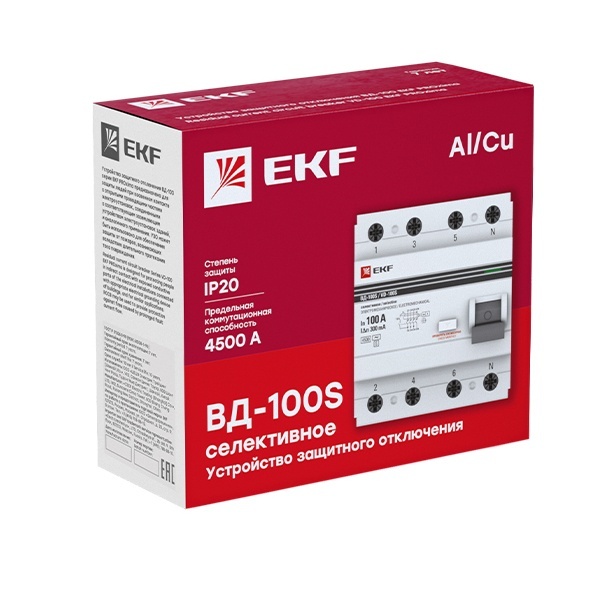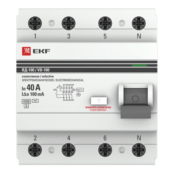 Четырехполюсный дифференциальный выключатель ВД-100 ЭКФ PROxima, номинальный ток 40 Ампер, 100 мА тип AC с селективной защитой elcb-4-40-100S-em-pro
