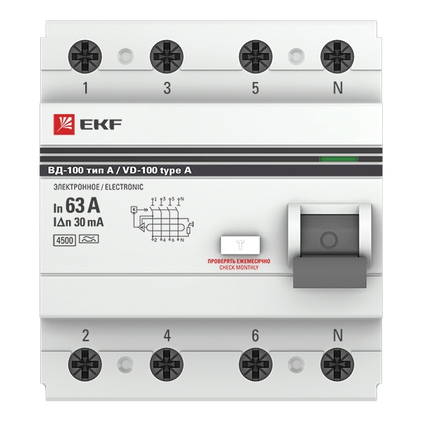 • УЗО EKF PROxima ВД-100 4P 63А/ 30мА (электронное) А (ВДТ)