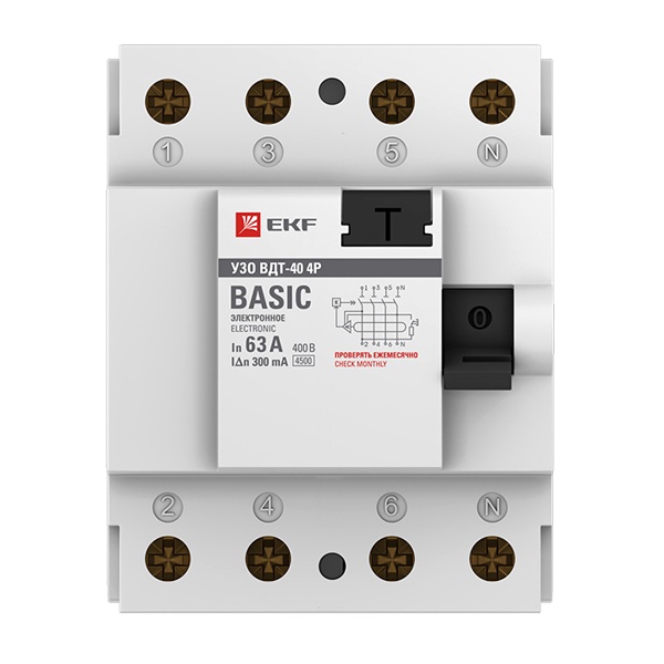 Выключатель дифференциального тока (УЗО) 4п 63А 300мА ВДТ-40 (электрон.) Basic EKF elcb-4-63-300e-sim