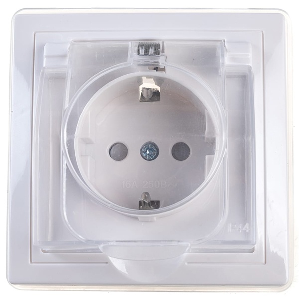 Механизм одноместной розетки с защитными шторками и заземляющими контактами, с большой откидной прозрачной крышкой, с защитой от брызг, скрытого монтажа ИЭК КВАРТА, цвет белый ERK71-K01-10-DM-44