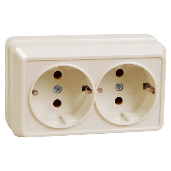 Электрическая внешняя кремовая розетка двойная силовая 16А электросети 220В IP20 открытой установки на стену ERO21-K33-16-DC