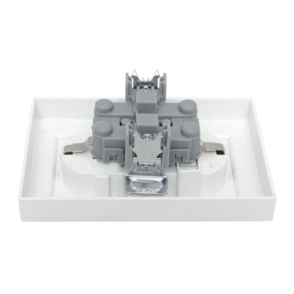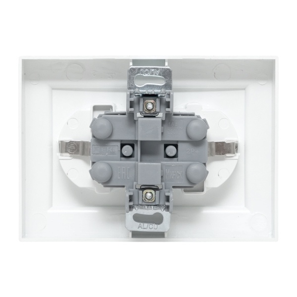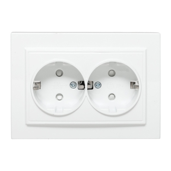 Двойная электрическая розетка немецкого стандарта с защитными шторками для скрытой установки в одну монтажную коробку в сухих помещениях, белого цвета, ЕКФ серии Минск. ERR16-128-100