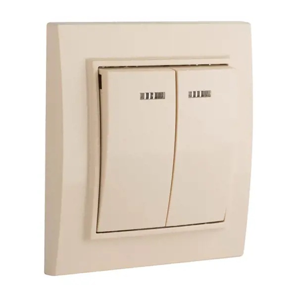 Двухклавишный выключатель с подсветкой для скрытой установки в сухих помещениях, бежевого цвета, ЕКФ серии Минск. ERV10-123-20