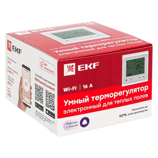 Умный термостат для тёплого пола позволяет выставлять температуру как на самом термостате, так и из приложения EKF Connect или через голосовой помощник от Яндекса - Алису, Можно включать тёплый пол по расписанию. У термостата два датчика температуры - встроенный датчик температуры воздуха и выносной датчик температуры пола. Также есть функция антизамерзания, которая включить тёплый пол, если температура опустится ниже 5 градусов и функция определения открытого окна, которая отключит тёплый пол на время проветривания, чтобы не тратить энергию зря. Умный терморегулятор делает дом более комфортным и экономит электроэнергию.
