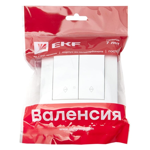 Проходной двухклавишный выключатель скрытой установки, для сухих помещений, белого цвета, ЕКФ серия Валенсия. EWV10-027-10