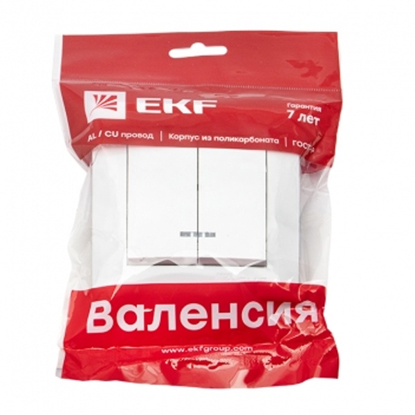 Двухклавишный выключатель с лампой индикации, скрытой установки, для сухих помещений, белого цвета, ЕКФ серия Валенсия. EWV10-123-10