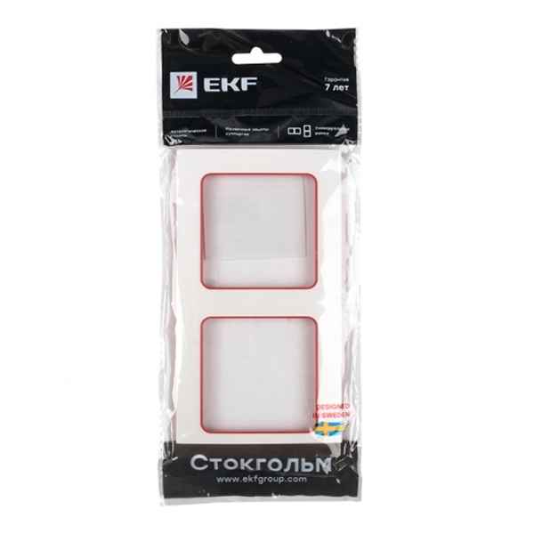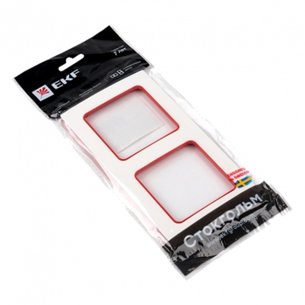 Двухпостовое обрамление из пластика прямоугольной формы, для электроустановочных механизмов ЕКФ, коллекция Стокгольм, белого цвета с красной полосой EXM-G-305-20