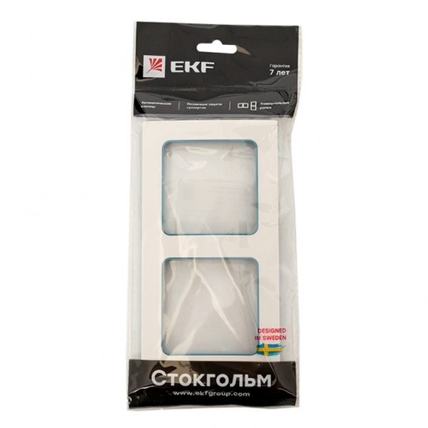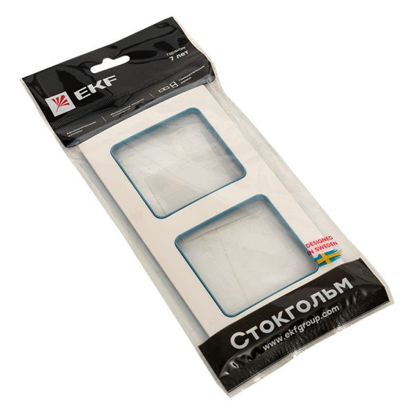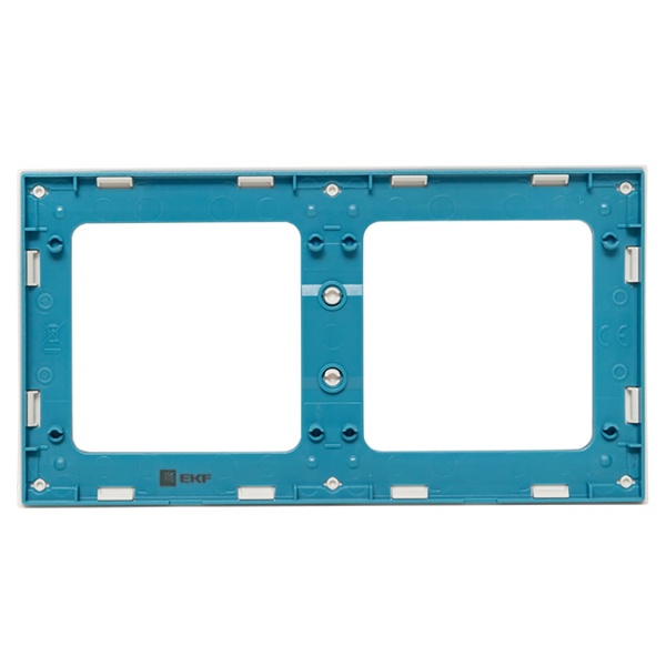 Двухпостовое обрамление из пластика прямоугольной формы, для электроустановочных механизмов ЕКФ, коллекция Стокгольм, белого цвета с синей полосой EXM-G-305-30