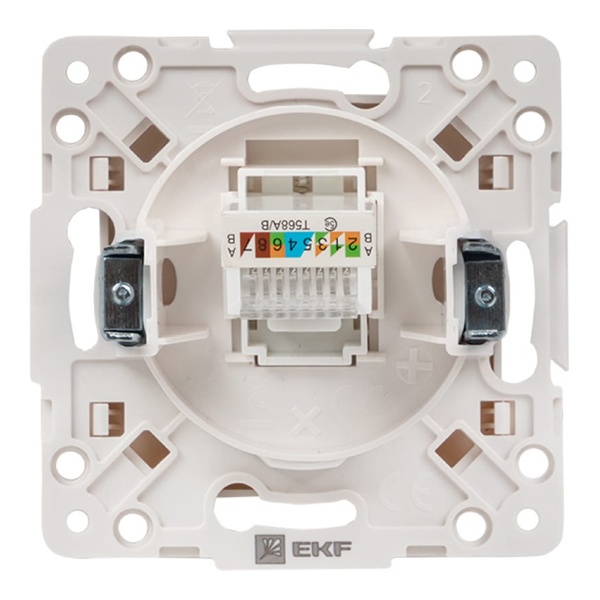 Механизм информационной розетки RJ45 для скрытой установки в сухих помещениях с накладкой белого цвета, ЕКФ серии Стокгольм. EYK01-035-10