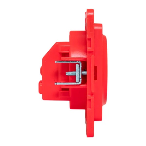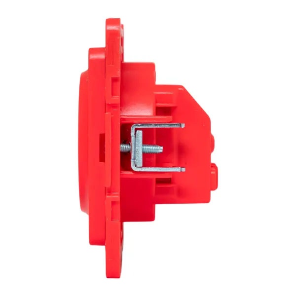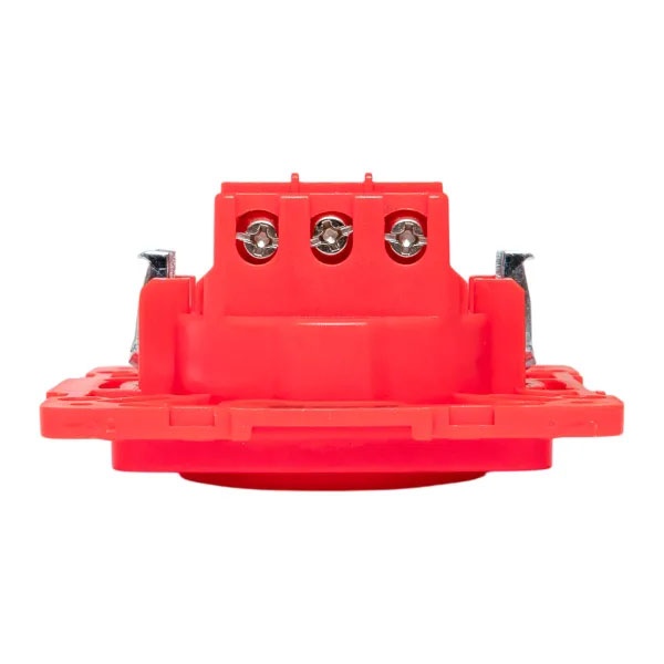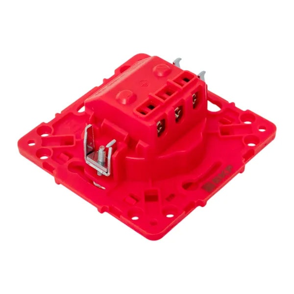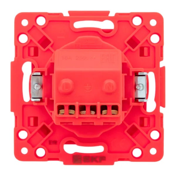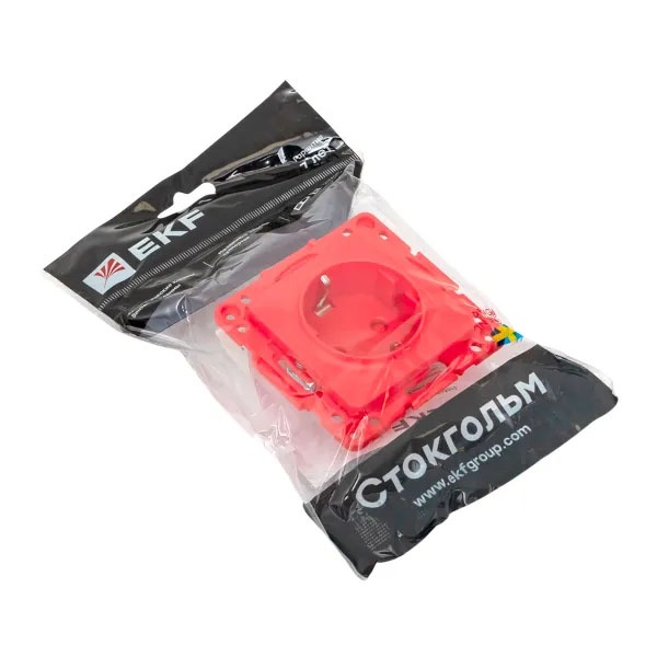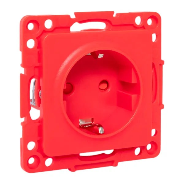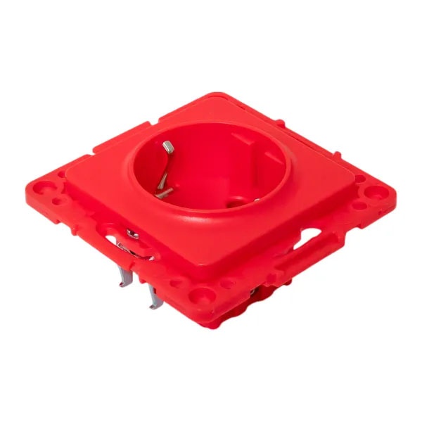 Механизм электрической розетки немецкого стандарта с защитой контактов и пружинным подключением для скрытой установки в сухих помещениях с накладкой красного цвета, ЕКФ серии Стокгольм. EYR16-028-30