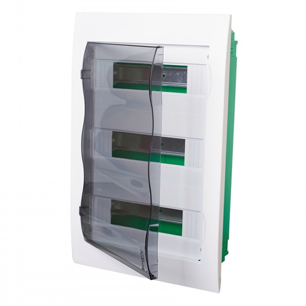 Распределительный щиток Schneider Electric серии Easy9 Box предназначен для установки аппаратов защиты и управления бытовой электроустановки. Щиток встраивается в стену, имеет 3 DIN-рейки для установки 36 аппаратов по 18 мм. Прозрачная дверь щитка может быть установлена с правой или левой стороны.