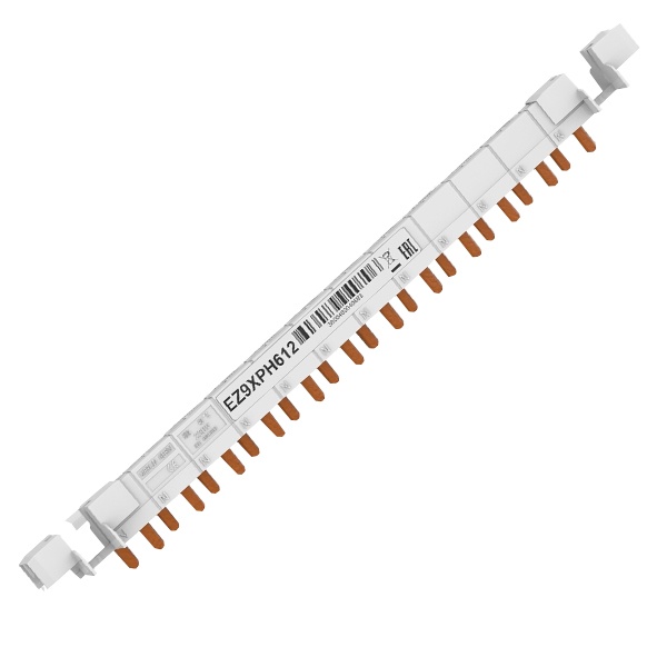 Гребенчатая шинка для компактных АВДТ серии Easy9 Schneider Electric, 1P+N, 12 модулей, шаг зубца 9 мм, на номинальный ток 63 А, тип разъема - PIN (штырь), цвет - светло-серый.