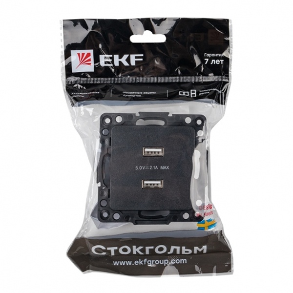 Механизм USB зарядки с двумя разъемами type A для скрытой установки в сухих помещениях с накладкой черный цвета, ЕКФ серии Стокгольм. EZR16-028-10-2USB