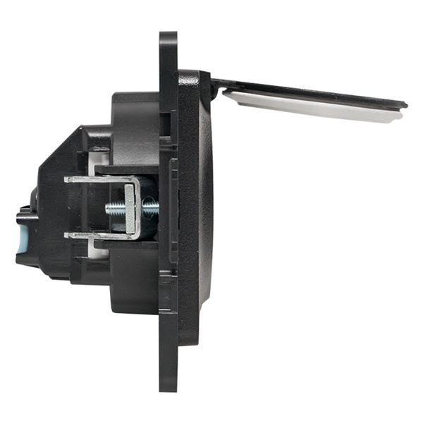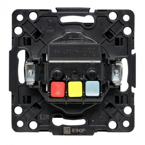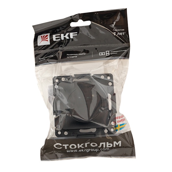 Механизм электрической розетки немецкого стандарта с защитой контактов, крышкой и пружинным подключением для скрытой установки с накладкой черного цвета, ЕКФ серии Стокгольм. EZR16-028-10-44