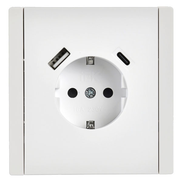 Одноместная электрическая розетка с заземлением и разъемами USB тип-A+С скрытого монтажа белого цвета FP-R14-16-U22-018-K01
