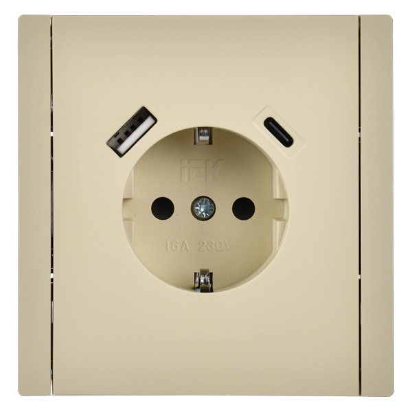 Одноместная электрическая розетка с заземлением и разъемами USB тип-A+С скрытого монтажа ванильного цвета FP-R14-16-U22-018-K10