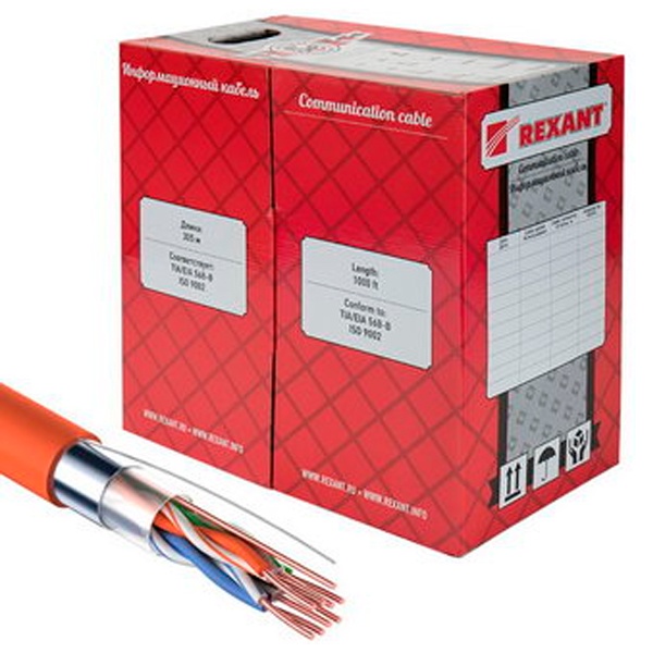 Кабель FTP 4PR 24AWG CAT5e 305м нг(А)-HF REXANT. Экранированная витая пара, материал проводника высокоочищенная бескислородная медь, диаметром 0,51 мм. (24 AWG). Материал оболочки – нг(А)-HF, огнестойкие, не распространяющие горение при групповой прокладке, безгалогенный композит, пониженной пожарной опасности с низкой коррозионной активностью продуктов горения и тления.