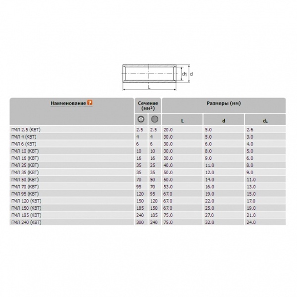 Гильзы кабельные медные ГМЛ (КВТ), закрепляемые опрессовкой, предназначены для соединения проводов и кабелей с медными жилами сечением от 2,5 до 240 мм.